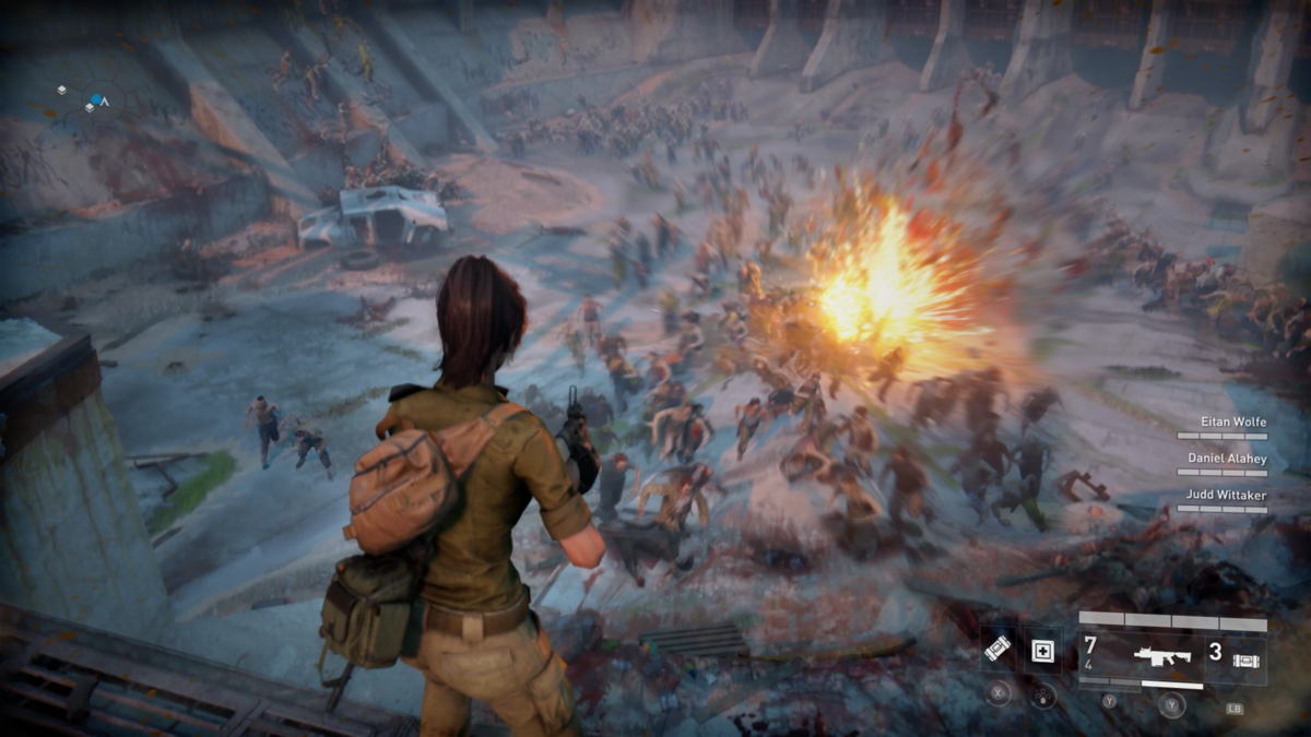 Mittlerweile sind wir fast am Ziel angekommen: einem abgestürzten Hubschrauber am Ufer eines eingefrorenen Sees oder Flusses. Wir haben einen Moment Verschnaufpause und müssen uns strategisch bewaffnen und positionieren. Dafür gibt es in direkter Umgebung besondere Kisten die Mörser, Maschinengewehr auf Lafette, Stacheldraht, Minen und Claymores bieten. Denn sobald eine Aktion durchgeführt wurde startet der Sturm. Und was ich sehe sieht einfach ... krass aus! Eine schöne Masse aus Infestierten springt von der weiter entfernten Brücke und läuft auf uns zu, klettert über Zäune und bahnt sich in unaufhaltbarem Tempo ihren Weg. Ob man sofort alles versucht niederzumähen oder wartet bis sie auf optimaler Entfernung sind gilt abzuwägen. Hier ist keine Zeit zum aufmunitionieren denn ehe man sich versieht sind sie über einem: Man muss auf seine Mates ein Auge haben!! Nach drei Wellen und über 1000 Gegnern, so die Entwickler (es hat sich auch so angefühlt), ist ein Signal abgesetzt und die Mission beendet.
