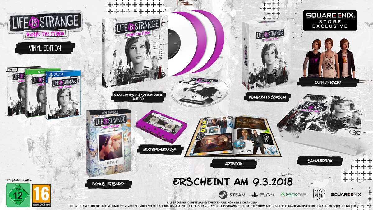 Square Enix hat eine Box Edition von Life is Strange: Before the Storm angekündigt. Am 09.03.2018 wird sie erscheinen, also am selben Tag wie die Bonus Episode "Farewell" des Spiels. Die Limited Edition enthält neben dem Spiel auf Disc ein Artbook und eine Soundtrack CD. Wer die Vinyl Edition (exklusiv verfügbar im Square Enix Store) bestellt, der erhält zusätzlich noch ein Set bestehend aus vier Schallplatten mit der Musik des Spiels.