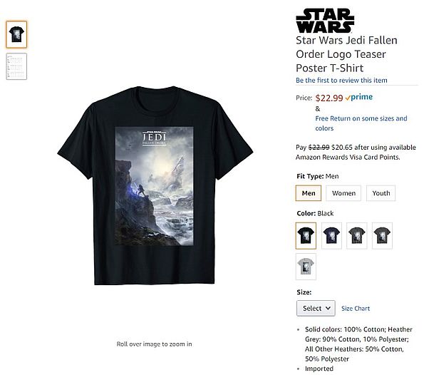"Get ready for a brand-new action adventure game coming to you this Holiday 2019 with this official Star Wars Jedi: Fallen Order teaser poster tee shirt. An original Star Wars story, Jedi Fallen Order follows a surviving Padawan and is set shortly after the events of Star Wars: Revenge of the Sith. This official Jedi Fallen Order teaser poster has just been revealed at Star Wars Celebration Chicago and the tee shirt is now available, hot off the press, right here on Amazon!", hieß es zum Artikel. Neben einer Story Info gab es auch die Info, dass es eigentlich erst nach der Premiere live gehen sollte. Der Artikel wurde nun aber von Amazon US entfernt.