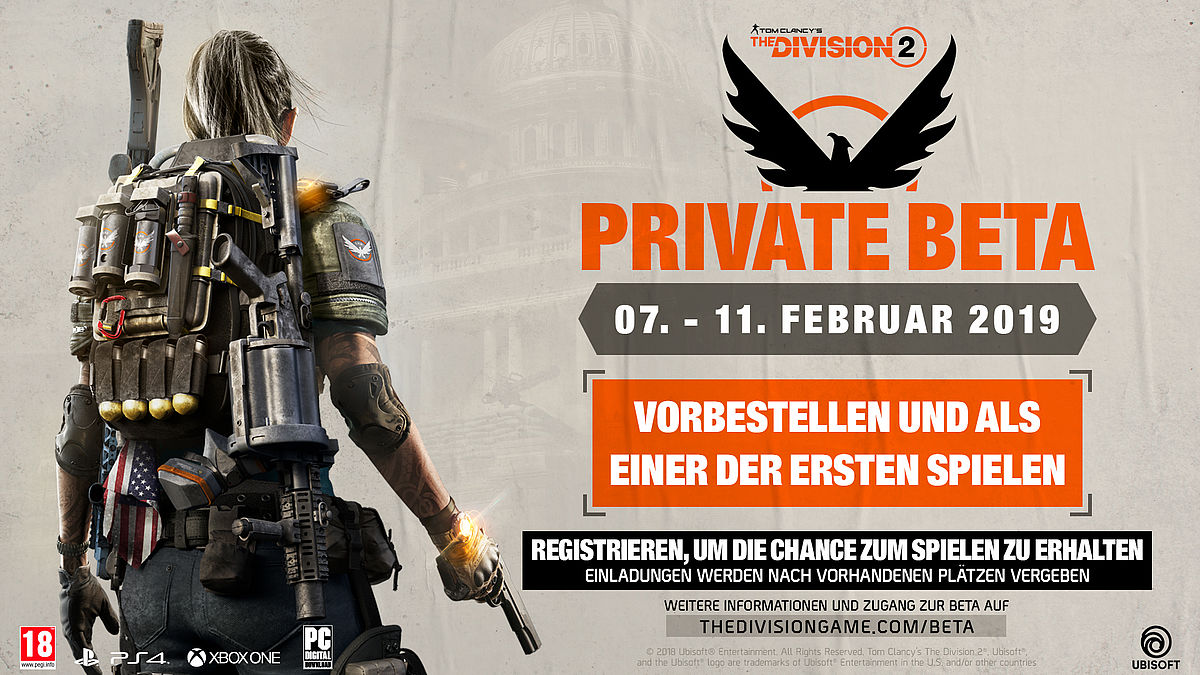 Ubisoft gab die Daten der Private Beta für Tom Clancy’s The Division 2 bekannt. Diejenigen Spieler, die Tom Clancy's The Division 2 vorbestellt haben, können das Spiel vom 7. bis 11. Februar 2019 ausprobieren. Alle anderen haben die Möglichkeit, an der Private Beta teilzunehmen, indem sie sich hier registrieren.