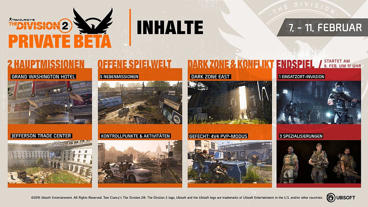 Ubisoft kündigte die Inhalte der Tom Clancy's The Division 2 Private Beta an. Pre-Load Private Beta startet am 06.02.2019 ab 10 Uhr MEZ. Xbox One-, PS4- und PC-Spieler können sich ihren Zugang zur Private Beta absichern, indem sie Tom Clancy’s The Division 2 bei teilnehmenden Händlern vorbestellen. Zudem können sich die Spieler hier anmelden, um eine Chance zu erhalten, an der Private Beta teilzunehmen. Die Private Beta startet am 07.02.2019 um 10 Uhr MEZ und läuft bis zum 11.02.2019 10 Uhr MEZ.