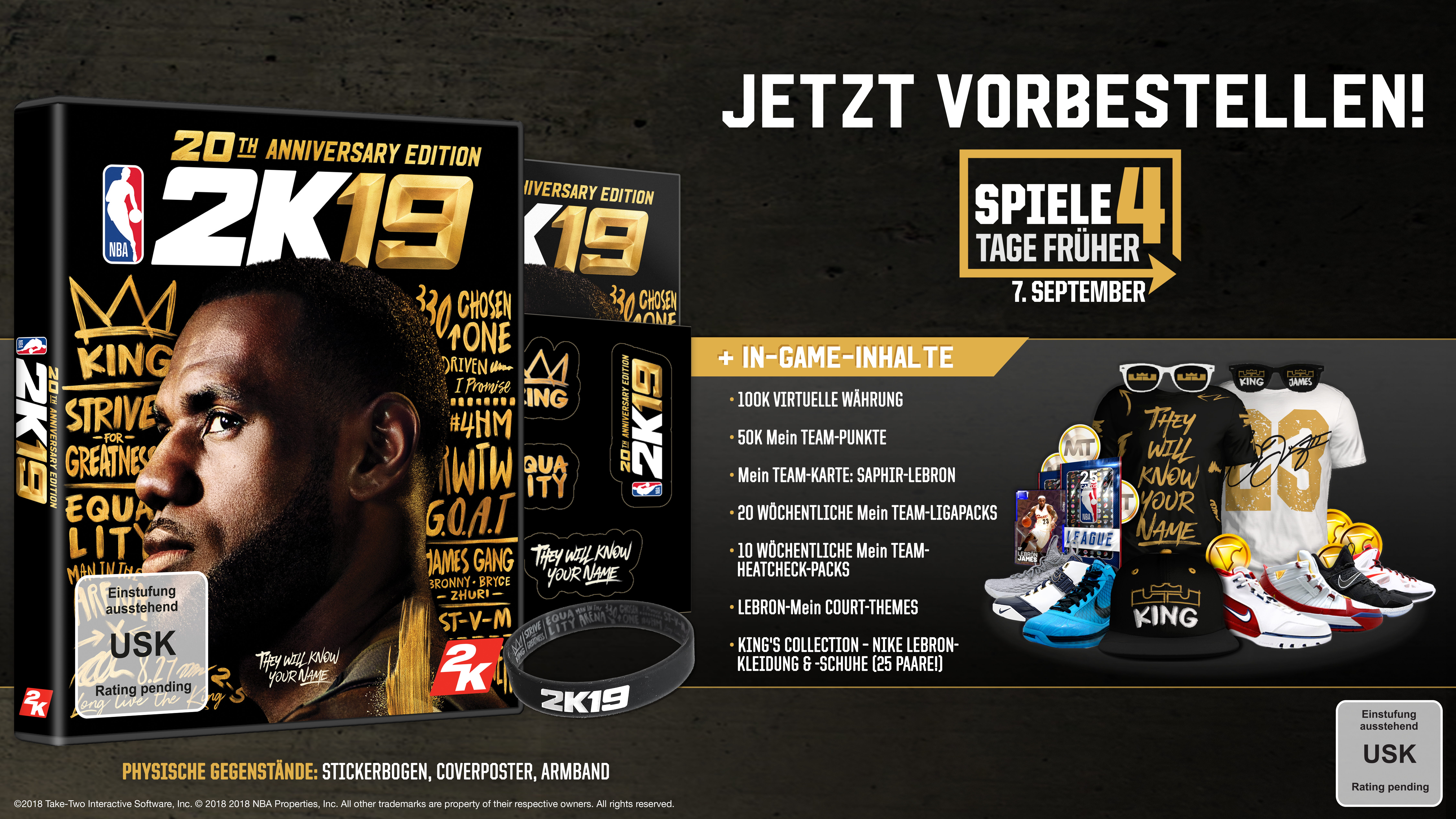 20th Anniversary Edition das Spiel vier Tage vor der Veröffentlichung, also schon ab dem 07.09.2018. Die NBA 2K19 20th Anniversary Edition enthält die folgenden digitalen Gegenstände: