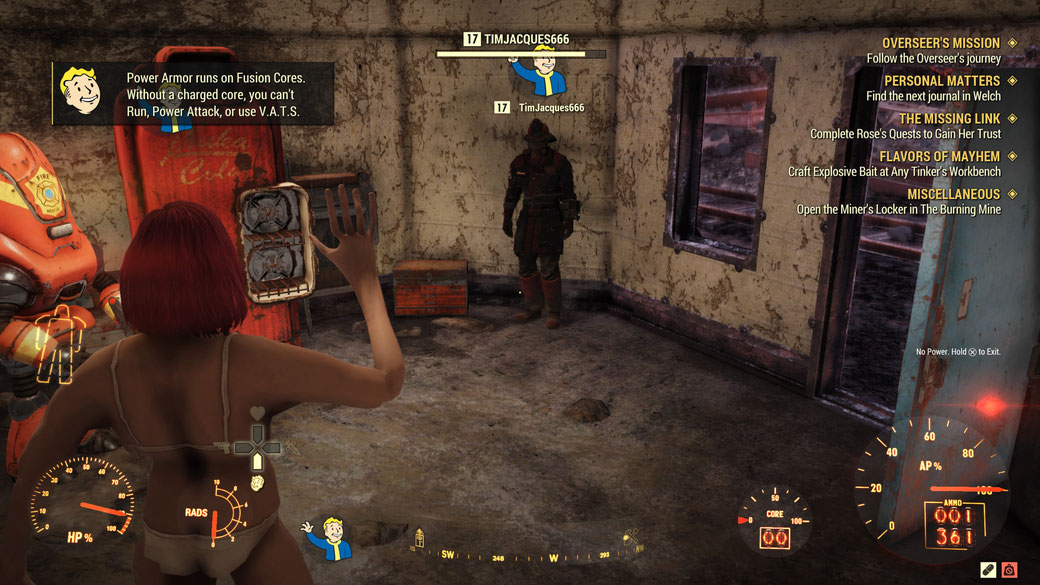 Wenn wir bei Missionen sind, sollte euch auch bewusst sein – ja, bei einigen klappt es super, die haben keine Probleme mit Bugs und Glitches, genießt es, solange ihr könnt – für andere wie mich sind aber nicht nur Nebenmissionen verbuggt, sondern vor allem auch Teile von Hauptmissionen. Ich soll etwas an der Workbench bauen? Super, ich muss davor nur die Materialen dafür einsammeln. Ich habe diese gesammelt, gehe zur Workbench – und habe keine mehr?! Aber der Step davor ist abgehackt? Naja, ärgerlich aber ok……. Also reise ich frustriert in mein C.A.M.P. und steige dort aus meiner TF – Armor (wobei ich endlich bei Level 15 mal eine gefunden habe *whoup whoup*, ich hatte scheinbar nie Glück und jemand anders war bereits da….) und diese steckt plötzlich in der Luft fest. Okay, ich konnte nicht mehr in diese einsteigen. Leicht zerknirscht aber mit der Anzeige, dass die Rüstung in mein Inventar gegeben wird, warte ich einfach etwas ab und lege mich zur HP Regeneration etwas aufs Ohr - in meiner noch nicht coolen Crib. Dann will ich, nachdem ich mir etwas feines gekocht habe, in meine Rüstung steigen und eine Mission weiterspielen– solange die andere Hauptmission ja einfach noch nicht funktioniert…- aber im Inventar ist meine Rüstung nicht zu finden. Auch meine Pip Boy Anzeige ist nicht grün sondern gelb. Und meine Rüstung ist nirgends zu finden. WOW. Danke für nichts. Seitdem habe ich immer wieder die Hauptmission versucht und neue Rüstungen gesucht. Leider vergebens - bislang.