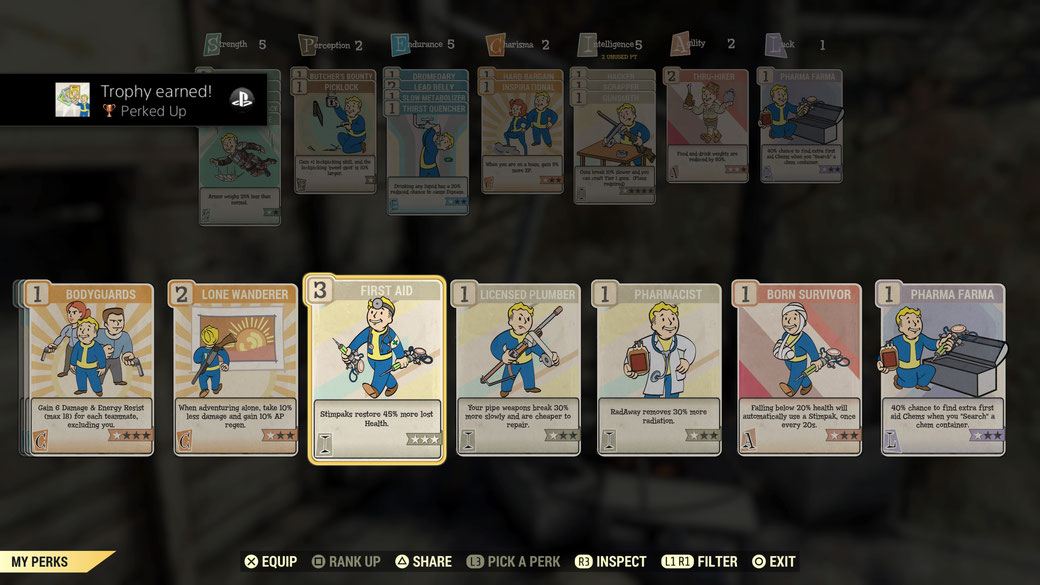 Das Perksystem wurde geändert. Zwar gibt es immer noch die S.P.E.C.I.A.L. (Strength, Perception, Endurance, Charisma, Intelligence, Agility, Luck) Kategorien, allerdings erhaltet ihr aus einem Card-Pack verschiedene Karten. Die Karten besitzen verschiedene Fähigkeiten für die jeweilige Kategorie. Beispiel: Ihr habt 4 Punkte in Strength, also dürft ihr euch vier Karten für Strength aussuchen, insofern diese jeweils einen Punkt besitzen. Ihr könnt auch eine Karte mit der Wertigkeit 2 mit zwei Karten der Wertigkeit 1 zusammen in euer Perk System bauen. Die Karten bestimmen somit relativ stark euren Spielstil, was ich des öfteren als äußerst unbefriedigend empfunden habe. Ich liebe es Terminals zu hacken habe aber keine Perk Karten dafür erhalten, genauso wenig für Lockpicks. Deswegen konnte ich oft Gegenstände nicht looten. Klar kann dann das Online System greifen, allerdings müsst ihr dann Spieler kennen bzw. in eurer Umgebung haben die diesen Skill besitzen und für euch den Gegenstand öffnen können. Ich habe davon gehört das diese Dinge passieren können, dies ist mir allerdings – leider – nicht selbst widerfahren. Ich fände es nützlicher, wenn ich selbst die Möglichkeit hätte, Karten einzutauschen, und dies nicht nur mit anderen Spielern.
