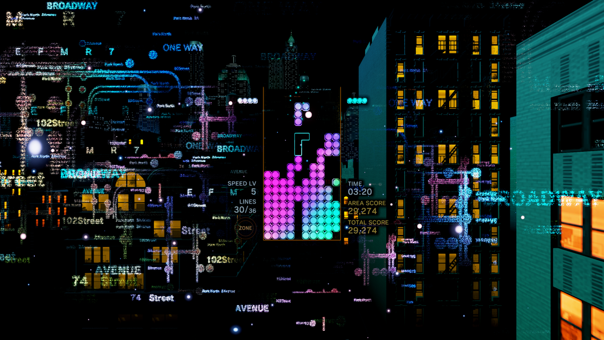 The Journey dient als Kampagnen Modus. Dieser besteht aus sieben Arealen, welche jeweils aus vier bis fünf Level bestehen. Nachdem ihr ein Areal beendet habt, könnt ihr eure Zeit sehen sowie eure Punktzahl. Wenn ihr in einem Level keine 36 Reihen zerstören könnt, fangt ihr bei diesem Level mit der Punktezahl 0 an, was gegen Ende eines Areals wirklich sehr deprimierend sein kann. Schafft ihr ein Level abzuschließen, nehmt ihr die übrigen Reihen mit in euren nächstes Level, dies kann positiv sein oder auch negativ (da ihr euch verbaut habt und das neue Level mit einer höheren Geschwindigkeit beginnt beispielsweise). Nach jedem erfolgreich absolvierten Areal erhaltet ihr eine Bewertung anhand eurer Punktezahl von SS bis D. Bei der neuen Mechanik finde ich es schade, dass es sich wesentlich mehr nach einer Belohnung anfühlt wenn ihr wirklich eure Reihen auf normalen Wege cleared. Nichtsdestotrotz erreicht die Mechanik, dass man sich "in the zone" fühlt und erreicht somit einen neuen Flow im Tetris Gameplay.
